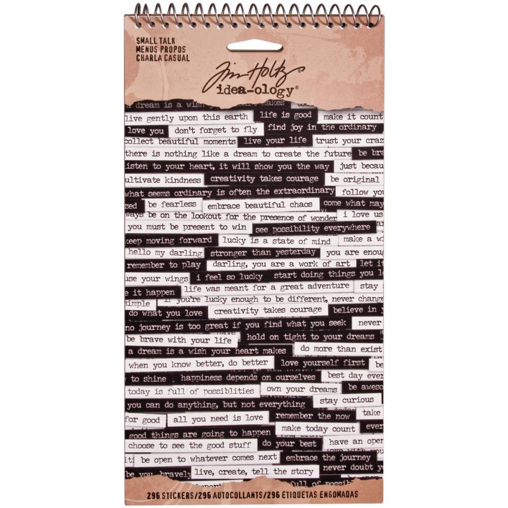 Tim Holtz Idea-Ology Small Talks -tarrakirja sisältää erilaisia englanninkielisä lauseita. Tarrat sopivat erinomaisesti kuvateksteiksi leikekirjoihin, ATC-kortteihin ja kalentereihin. Kierrekannellinen tarrakirja sisältää kuusi (6) arkkia tarroja: kolme (3) lausesarjaa, joista kukin on kahdessa värissä (valkoinen ja musta). Tarrakirja sisältää yhteensä 296 tarraa!