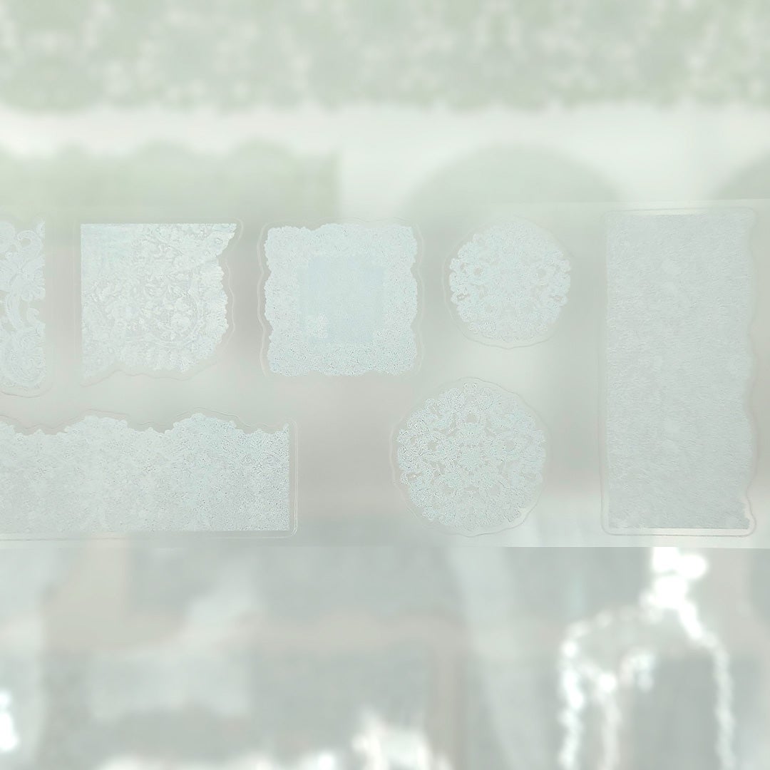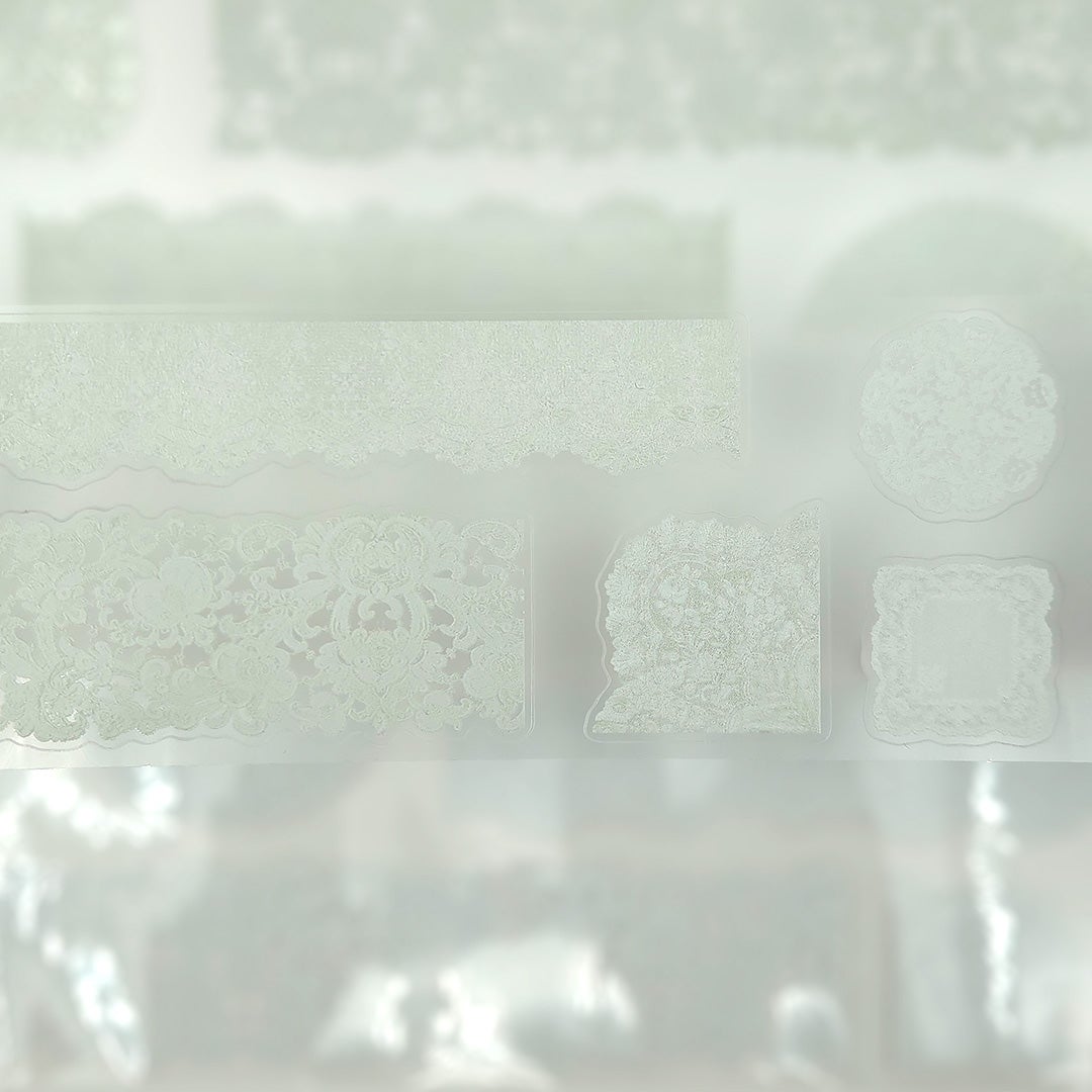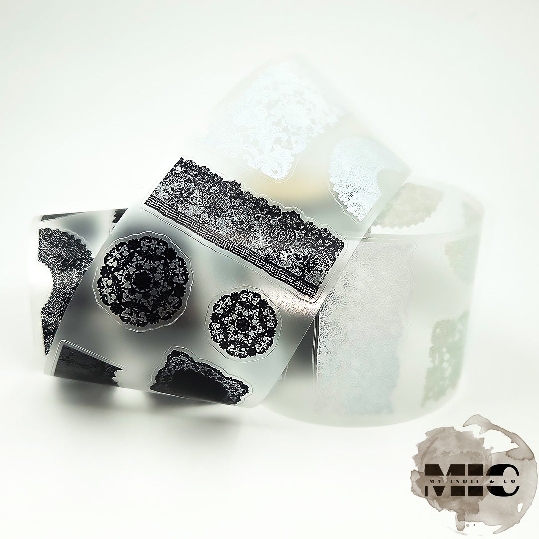 Yksi looppi PET-teippiä tausta/suojapaperilla. Kohokuvioidut kiiltävät ja valmiiksi leikatut kuvitukset mattapintaisella taustalla.