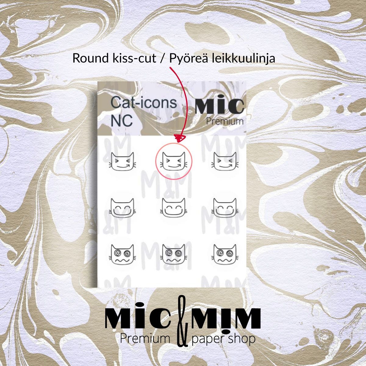 Cat-icons -tarra-arkki sisältää yhteensä 42 tarraa (pyöreä leikkaus, läpimitta n. 9mm).
