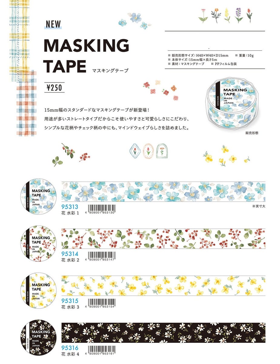 Lisää pehmeää ja taiteellista ilmettä muistikirjoihin, kalentereihin, scrapbookeihin ja askarteluprojekteihin Mind Waven Masking Tape -sarjalla. Tämä kokoelma sisältää herkkiä akvarellityylisiä kukkakuvioita sekä klassisia ruutukuoseja, jotka yhdistävät yksinkertaiset kuviot Mind Waven tunnistettavaan viehättävään tyyliin.