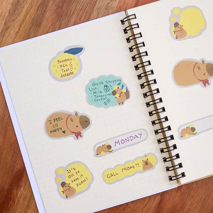 Söpöt muotoonleikatut liimattavat muistilaput rullassa, jossa on kuvituksia capybaroista! Leikkaa helposti pätkä ja jaa ystävien kanssa! Helppo kuljettaa, irrottaa ja kiinnittää! Sopii käytettäväksi mustekynän, korostuskynän, geelikynän ja tussin kanssa.